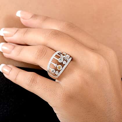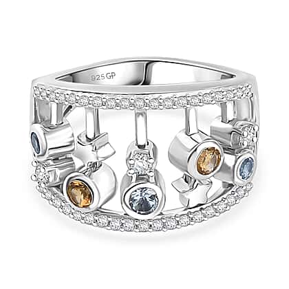 Oozing glamour in every detail, this multigemstone ring from GP Celestial Dream Collection can add a playful modernity to your look. It features a sculpted open-arc silhouette with bezel-cut stones. The ring is adorned with round citrine and sky blue topaz which helps to add yellowish-orange and serene blue tones to the design. Crafted in rhodium overlay sterling silver, this ring features pave line borders of white zircons which helps to add incredible sparkle to the design. This ring with openwork design also features a blue sapphire at the back. It is just the ring that lets you amp up your look without trying too hard.