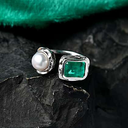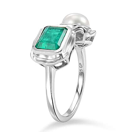 GP - Emeraldine Triplet Quartz, Fresh Water Pearl & Kanchanaburi Blue Sapphire Ring in Rhodium Overlay Sterling Silver 3.58 Ct.