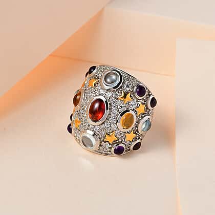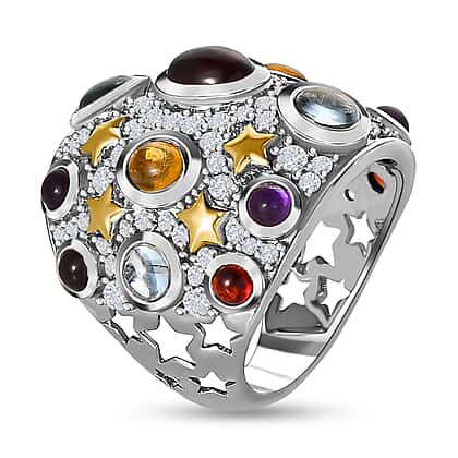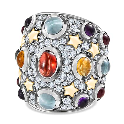 GP- Celestial Dream Collection - Red Garnet and Multi Gemstone Cluster Ring in Platinum and 18K Yellow Gold Vermeil Plated Sterling Silver 7.00 Ct, Silver Wt 11.84 GM