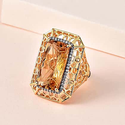 GP- Honeycomb Collection - (Fantasy Cut) Citrine and Natural Zircon Ring in 18K Vermeil Yellow Gold Plated Sterling Silver 11.60 Ct