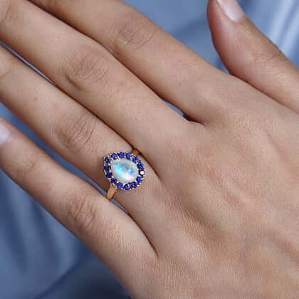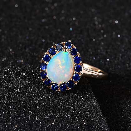 9K Yellow Gold AA Ethiopian Opal, Kanchanaburi Blue Sapphire Halo Ring 1.66 Ct.