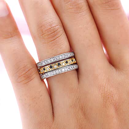 The ring is designed to create a different pattern to give a new look to your jewellery collection. This interchangeable ring is a must-add to your collection. The centre band of the ring is engraved with tiny triangles in vermeil yellow tone. Each triangle is studded with boi poi black spinel and natural Cambodian zircon, alternatively covering half of the band. The second half is engraved with criss cross stripes in rose gold-tone studded with blue sapphire inner the shank. The two supporting half bands are studied with zircons closely. The half bands are connected with the movable hinge for easy movement. By moving the half band, you can create different designs for different occasions.
