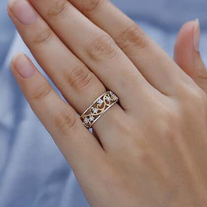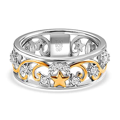 Drape this moissanite band ring to create a good charm for each attire. The designer artwork of this ring by GP makes it a unique addition to your jewellery box. Crafted using 925 sterling silver, this ring features two round bands joined together through a beautiful artwork in the middle featuring celestial-inspired charm. The metal scrollwork is accentuated with the vermeil 18K yellow gold and gives a unique hue to this ring. The round faceted-cut moissanite pieces come into the picture and become the centre of attraction with their channel setting all around this ring and complete the look of this stunner.