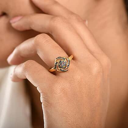 Make every hand movement stand out with this multi gemstone fancy ring, designed with a swirling open pattern and a clustered champagne diamond centre. The round focal top brings together mixed gemstones in a tight mosaic layout, framed by flowing yellow tone metal curves that wrap around the setting. The raised head and split style shoulders add depth and dimension from every angle. Crafted in 18K yellow gold vermeil on 925 sterling silver, this piece ensures lasting shine and durability. A design led ring focused on colour contrast, curved lines, and detailed top work.