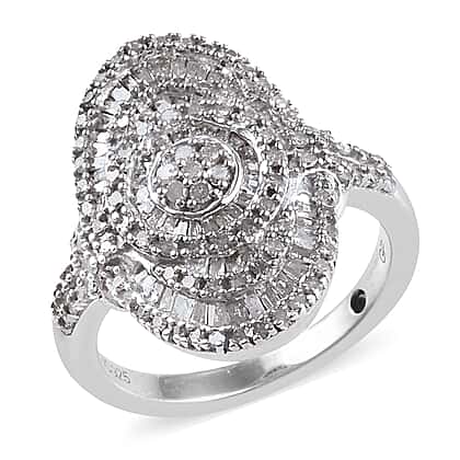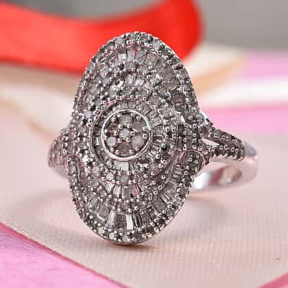- A bold ring featured with the sheen of multiple diamonds, in round and baguette cut