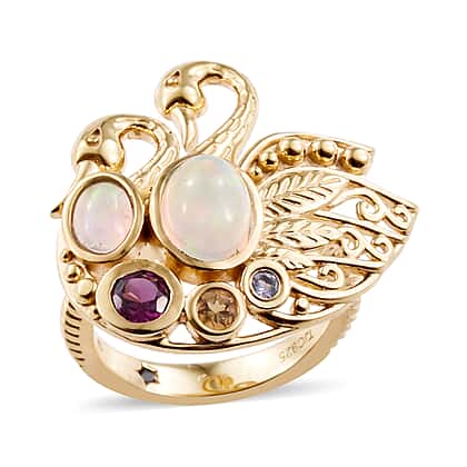 GP Ethiopian Welo Opal (Rnd), Multi Gemstone Swan Love Ring in 14K Gold Overlay Sterling Silver 1.500 Ct.