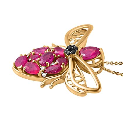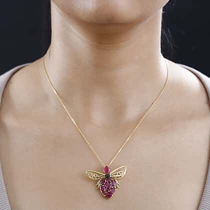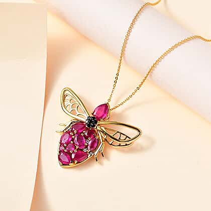 A vibrant design inspired by nature, this African Ruby & Multi Gemstone Pendant is carefully crafted out of sterling silver and shaped like a beetle. The pendant and accompanying chain are draped in 18K yellow gold vermeil to lend them a luxurious finish. The golden glow seamlessly complements the rich rubies and black spinels studded within the creature’s body.