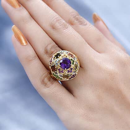 GP Italian Garden Collection - Amethyst & Multi Gemstone Ring in 18K Vermeil Yellow Gold Plated Sterling Silver 4.00 Ct, Silver Wt. 7.44 Gms
