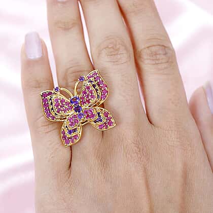 GP Italian Garden Collection - Amethyst and Ruby(FF) Butterfly Interchangeable Ring and Pendant in 18K Vermeil Yellow Gold Plated Sterling Silver 5.25 Ct
