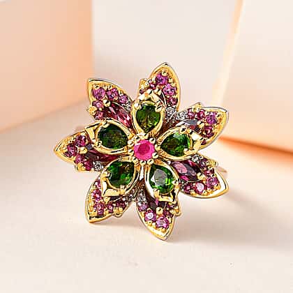 GP Italian Garden Collection - Natural Chrome Diopside & Multi Gemstone Floral Ring in 18K Yellow Gold Vermeil Plated Sterling Silver 3.09 Ct