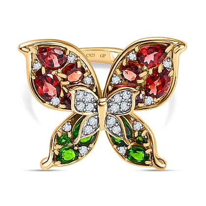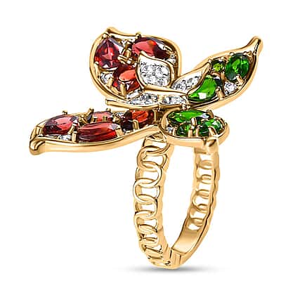GP Italian Garden Collection - Red Garnet, Natural Chrome Diopside, Natural Zircon Ring in 18K Vermeil Yellow Gold Plated Sterling Silver 6.00 Ct, Silver Wt. 6.89 Gms