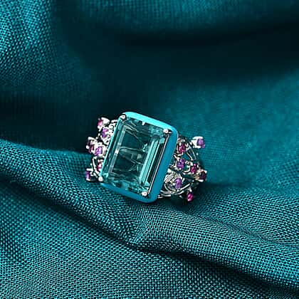 GP Italian Garden Collection - Teal Fluorite, Rhodolite Garnet, Blue Sapphire & African Amethyst Ring in Rhodium Overlay Sterling Silver 10.12 Ct, Silver Wt. 5.40 Gms.
