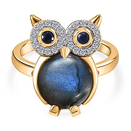 GP Collection - Labradorite, Kyanite and White Zircon Owl Ring in 18K Vermeil Yellow Gold Plated Sterling Silver 5.32 Ct.