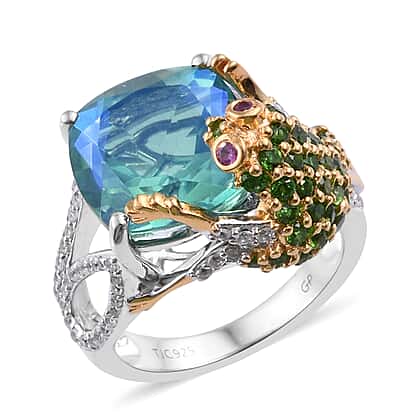 GP Peacock Quartz (Cush 12x12 mm), Multi Gemstone Frog Ring in Platinum and Yellow Gold Overlay Sterling Silver 8.250 Ct, Silver wt 5.70 Gms