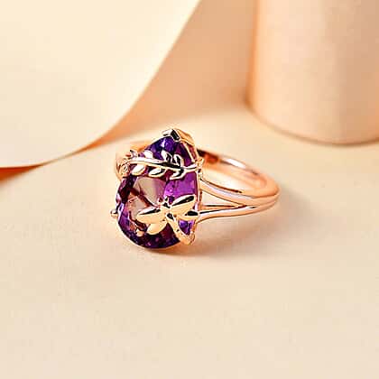 GP Collection The Rose De France Amethyst Solitaire Ring boasts an exquisite drop architecture in 18K Rose Gold Vermeil finish. The drop statement is often seen as a symbol of status and grace and invariably finds its way into the collection of jewellery connoisseurs. The designing in Sterling Silver is impeccable and flawless. The leaf adornment in metal redefines the beauty of a solitaire ring.