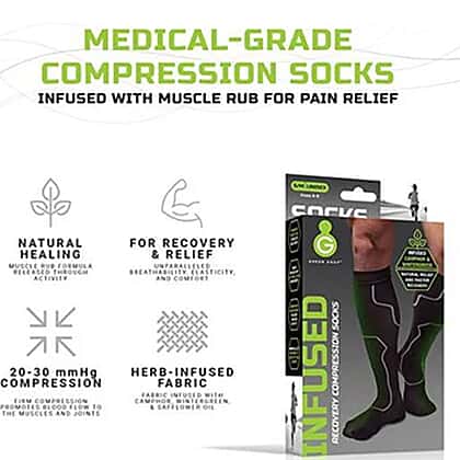The Green Drop Compression Socks in Black offer medical-grade compression designed to provide support and enhance circulation. These socks are perfect for athletes, travelers, or anyone in need of relief from leg fatigue or swelling. Made with high-performance materials, the socks offer targeted compression to promote blood flow, reduce discomfort, and improve recovery times. The sleek black design ensures they remain discreet and stylish. Whether you're exercising, traveling, or recovering, these socks are an essential addition to your routine for better leg health.