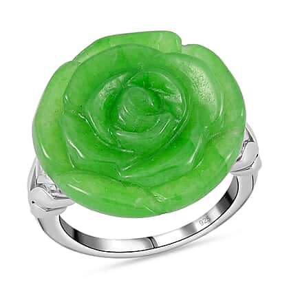 Delicately crafted, this exquisite green jade floral ring exudes elegance and sophistication. The centrepiece, a stunningly carved green jade, is shaped into a delicate rose design, symbolising grace and beauty. Highlighting the jade are sparkling white zircons set in a rhodium overlay on sterling silver, enhancing the ring's allure. This piece is perfect for adding a touch of nature-inspired luxury to any outfit.