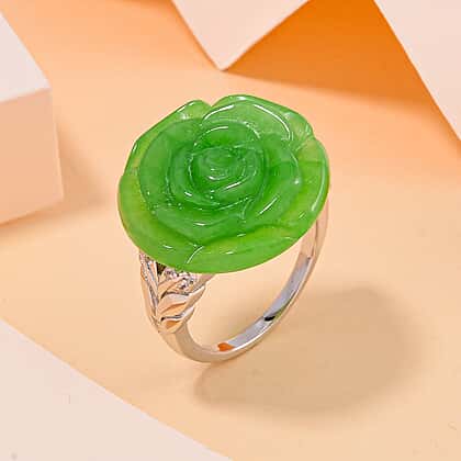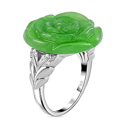 Green Jadeite Jade & Natural Zircon Floral Ring in Rhodium Overlay Sterling Silver 18.25 Ct, Silver Wt 5.00 GM