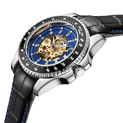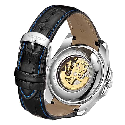 Discover the Globenfeld Limited Edition Cage Automatic Blue men’s watch, a captivating timepiece that demands attention with every glance. This hand-assembled marvel boasts a 162-parts, 21-jewel movement, offering precision and sophistication. The cobalt-blue skeleton dial invites you to behold the mechanics within, paired seamlessly with a robust steel IP case. This timepiece isn't just about keeping time; it's about making a statement, complemented by a luxurious black leather strap with blue stitching for that final touch of class.
