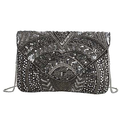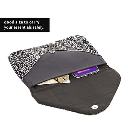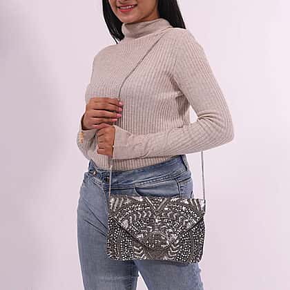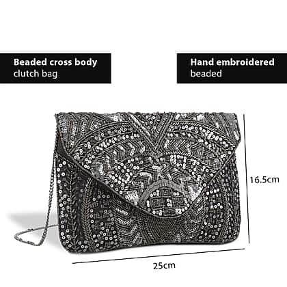 Hand embroidered Beaded Pattern Crossbody Clutch Bag with Shoulder Strap (Size 25x16 Cm) - Grey