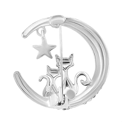 Austrian White Crystal Twin Cats & Moon Brooch in White & Yellow Gold Colour Tone
