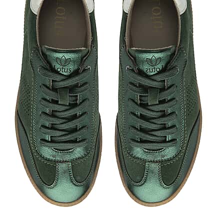 Bold, playful, and made to stand out, the Lotus Frapporta Ladies Leather Trainers bring a fashion-forward twist to everyday sneakers. Crafted from smooth leather with a high-shine metallic green finish, these trainers instantly lift casual looks. The lace-up design offers a secure, comfortable fit, while the cushioned insole supports all-day wear. Set on a classic gum sole, they balance retro charm with modern attitude. Whether styled with denim, dresses, or athleisure, these trainers add a confident pop of colour to your off-duty wardrobe. Fun yet wearable, they’re perfect for women who like their comfort with a touch of glam.