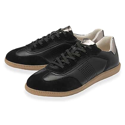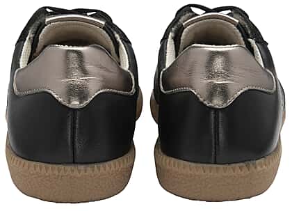Bold, playful, and made to stand out, the Lotus Frapporta Ladies Leather Trainers bring a fashion-forward twist to everyday sneakers. Crafted from smooth leather with a high-shine metallic black finish, these trainers instantly lift casual looks. The lace-up design offers a secure, comfortable fit, while the cushioned insole supports all-day wear. Set on a classic gum sole, they balance retro charm with modern attitude. Whether styled with denim, dresses, or athleisure, these trainers are perfect for your off-duty wardrobe. Chic yet wearable, they’re perfect for women who like their comfort with a touch of glam.