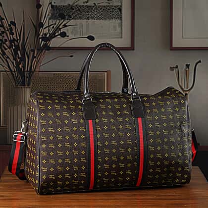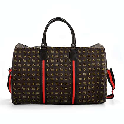 Monogram Pattern Travel Duffel Bag with Red Stripe Detail (50 x 30 cm) - Coffee