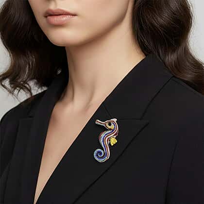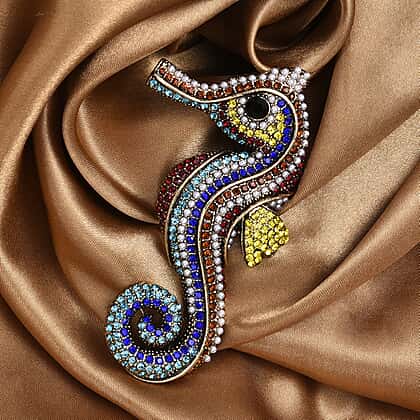 Multi Colour Crystal & Plastic Pearl Seahorse Brooch in Antique Gold Tone