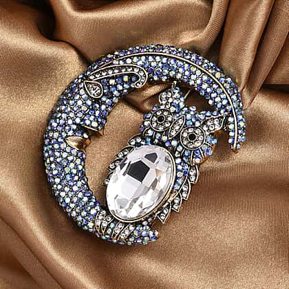 Multi Colour Crystal & White Glass Moonlight Owl Brooch in Antique Gold Tone