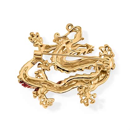 Introducing an extraordinary, dramatic, dragon-inspired brooch that draws attention with its captivating red enamel and yellow gold tone. Expertly crafted in pure alloy, the brooch offers durability and lasting shine. The richness of yellow gold plating is a true reflection of mythical beauty and enduring shine. This majestic beauty is perfect for enhancing any outfit, whether it's a bag, scarf, coat, or jacket. Bring opulence with exceptional artistry to your jewellery collection with this yellow gold-plated dragon brooch.