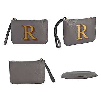 100% Genuine Leather R Letterpress Wristlet Clutch - Grey