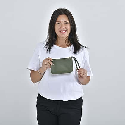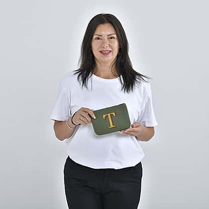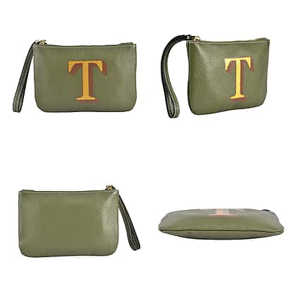 100% Genuine Leather T Letterpress Wristlet Clutch - Army Green