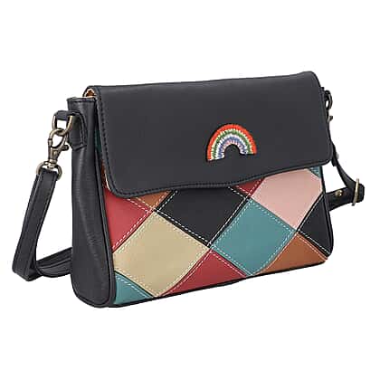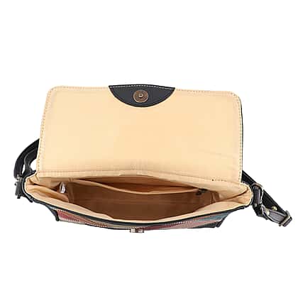 100% Genuine Leather Crossbody Bag with Flap (Size 23x5x18cm) - Black and Multi Colour