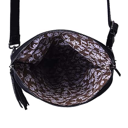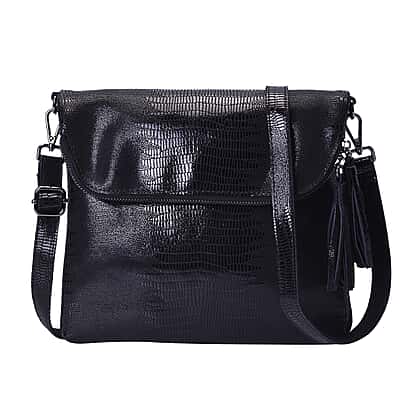 100% Genuine Leather Lizard Skin Pattern Crossbody Bag with Adjustable Strap - Black