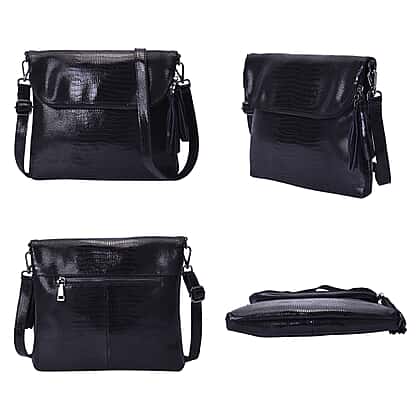 100% Genuine Leather Lizard Skin Pattern Crossbody Bag with Adjustable Strap (Size 24x3x24 Cm) - Black