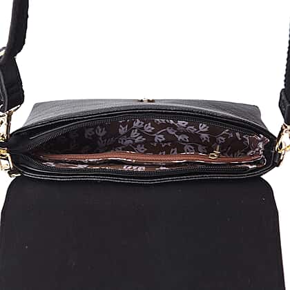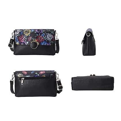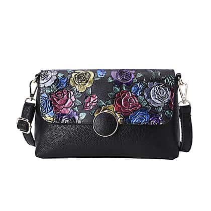 100% Genuine Leather Multi Colour Floral Embossed Pattern Crossbody Bag (25x18x7cm) with Magnetic Closure in Black