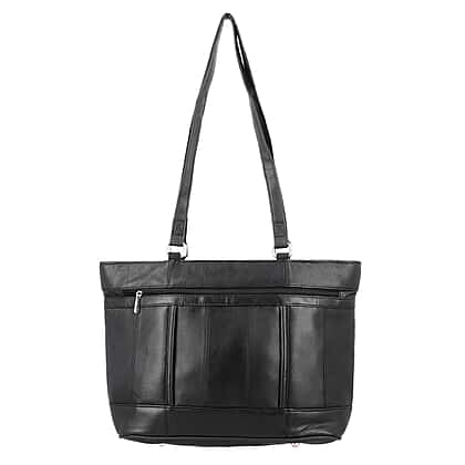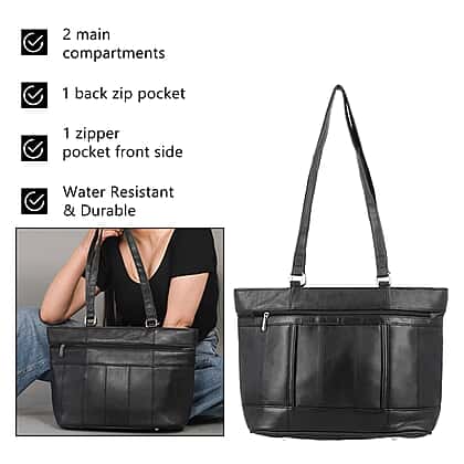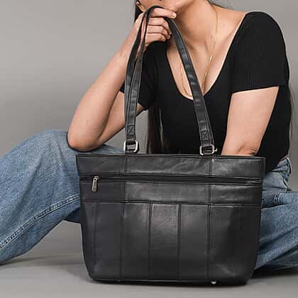 100% Genuine Leather Quilted Tote Bag with Drop Handle - Black
