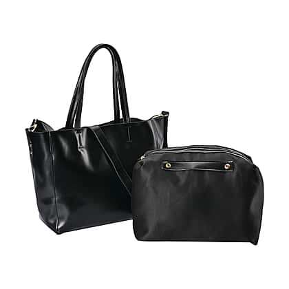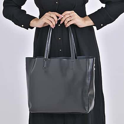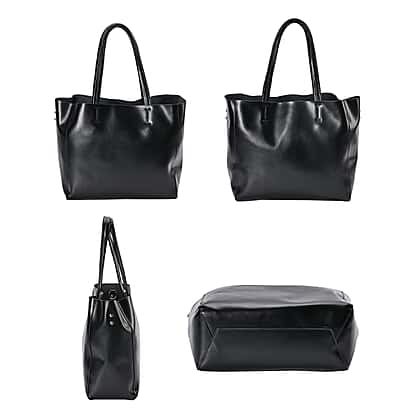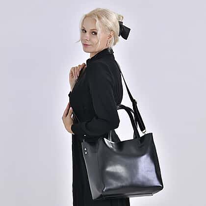Genuine Leather Tote Bag with Detachable Zipped Lining - Metallic Black