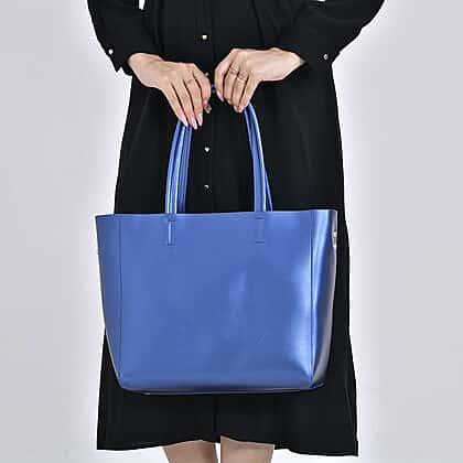 Genuine Leather Tote Bag with Detachable Zipped Lining - Metallic Blue