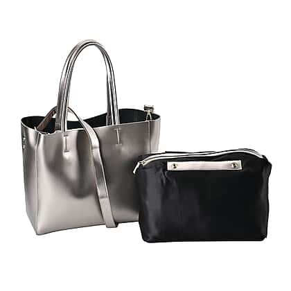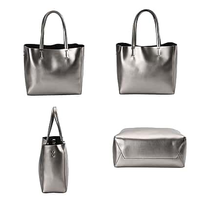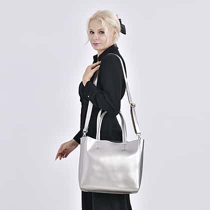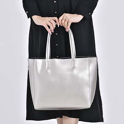 Genuine Leather Tote Bag with Detachable Zipped Lining - Metallic Silver