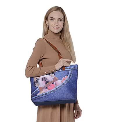 Adorable Black and White Dog in Jeans Pocket Print Tote Bag in Blue (42x9x32cm)