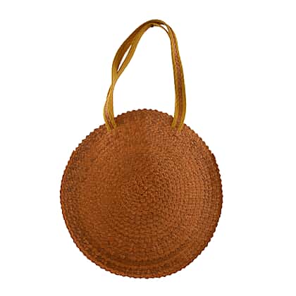 Bali Collection Palm Leaf Sisik Pattern Woven Round Bag with Leather Strap - Brown