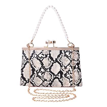Boutique Inspired- Python Pattern Clutch Closure Crossbody Bag with Dangling Pearl Chain and Metallic Shoulder Strap