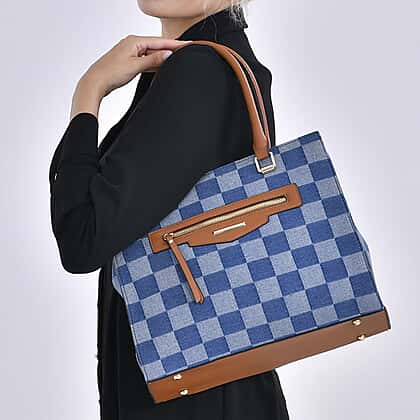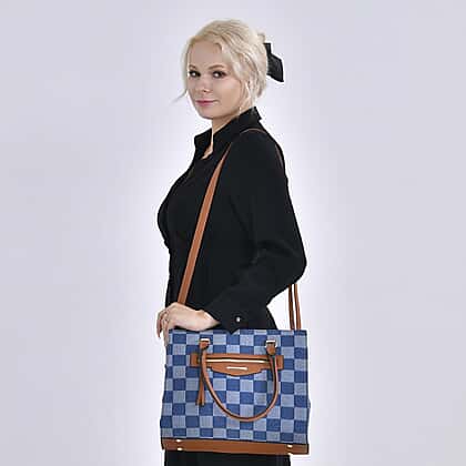 Checker Pattern Crossbody Bag With 2 Exterior Zipper Pockets - Handle Drop - Blue