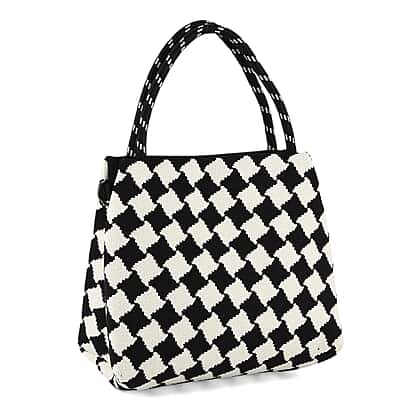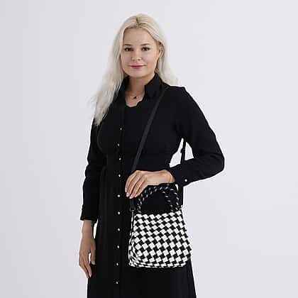 Checkerboard Pattern Handbag with Shoulder Strap (130cm) - Black & White