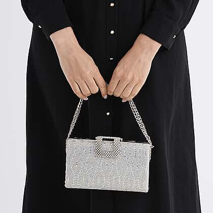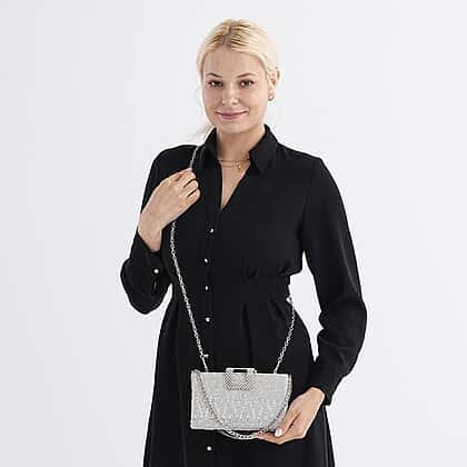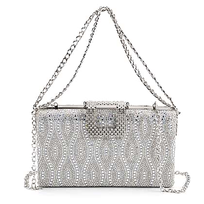 CLOSEOUT DEAL - Crystal Embellished Evening Clutch Bag with Metallic Chain Strap - Silver