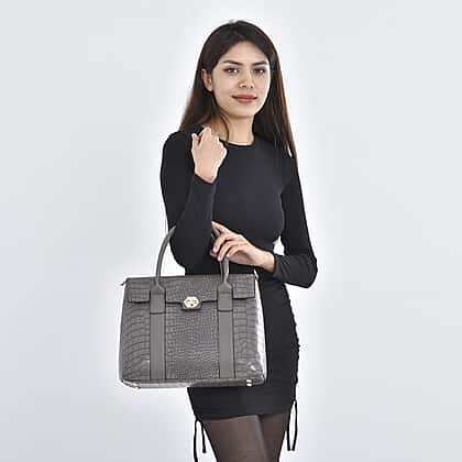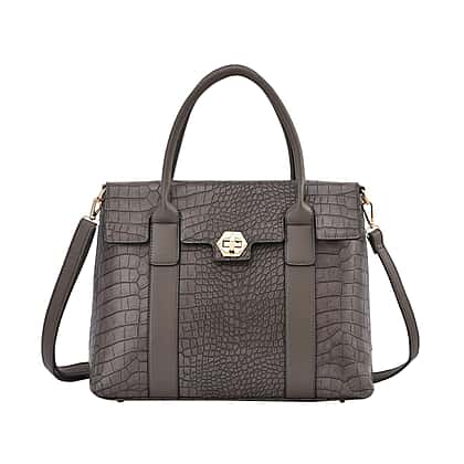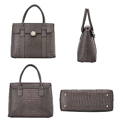 Croc Embossed Fully Lined Bag with Twist Lock and Detachable Long Strap - Grey