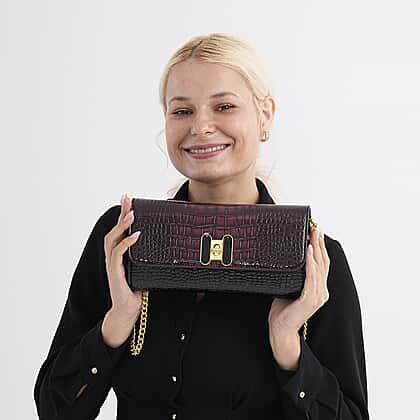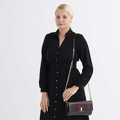 Crocodile-Embossed Pattern Two-Tone Wallet Crossbody Bag with Chain Strap - Burgundy & Black