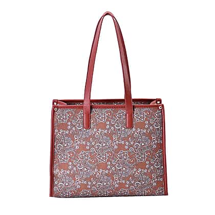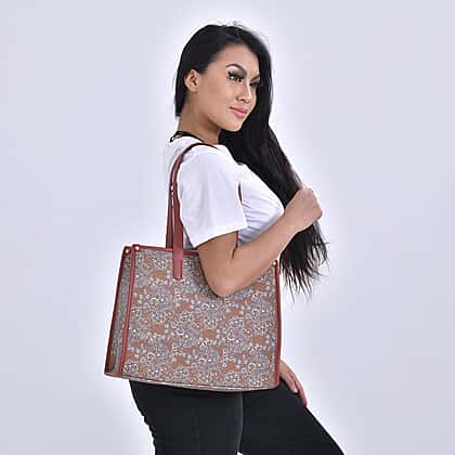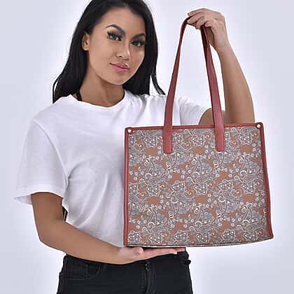 Designer Closeout- Fully Lined Jacquard Canvas PaisleyTote Bag with Zipper Closure and Handles - Tan